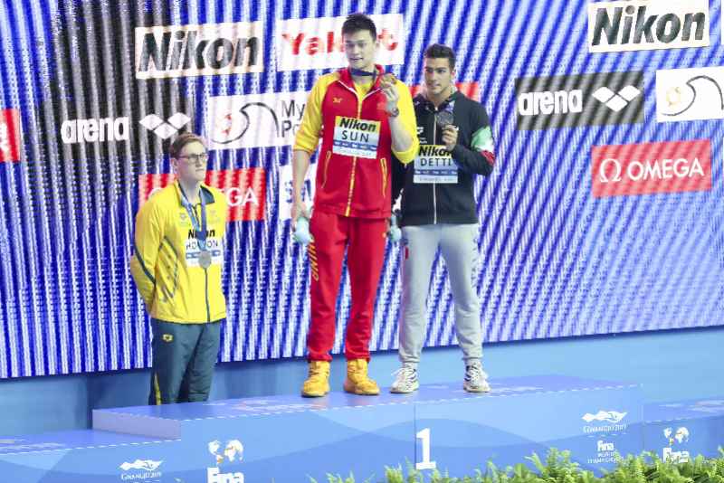 2019年7月21日 ,在孙杨夺得世锦赛男子400米自由泳四连冠后,获得第二名的澳大利亚人霍顿在颁奖典礼上公然拒绝登上领奖台。对此,孙杨反击称:耍这种“小伎俩”,自己不会受影响。 新华社记者李钢摄
